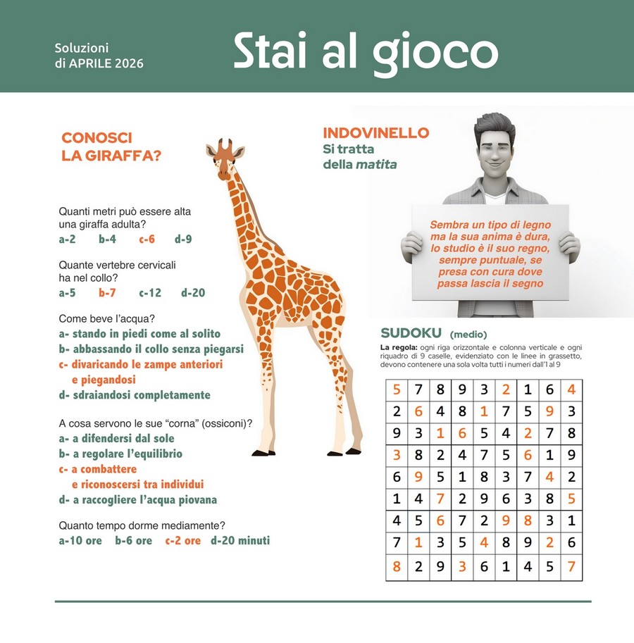 Cliccando sul tasto sottostante "Leggi tutto" troverete le soluzioni dei giochi pubblicati sulla nostra rivista del mese corrente e di quelli precedenti.