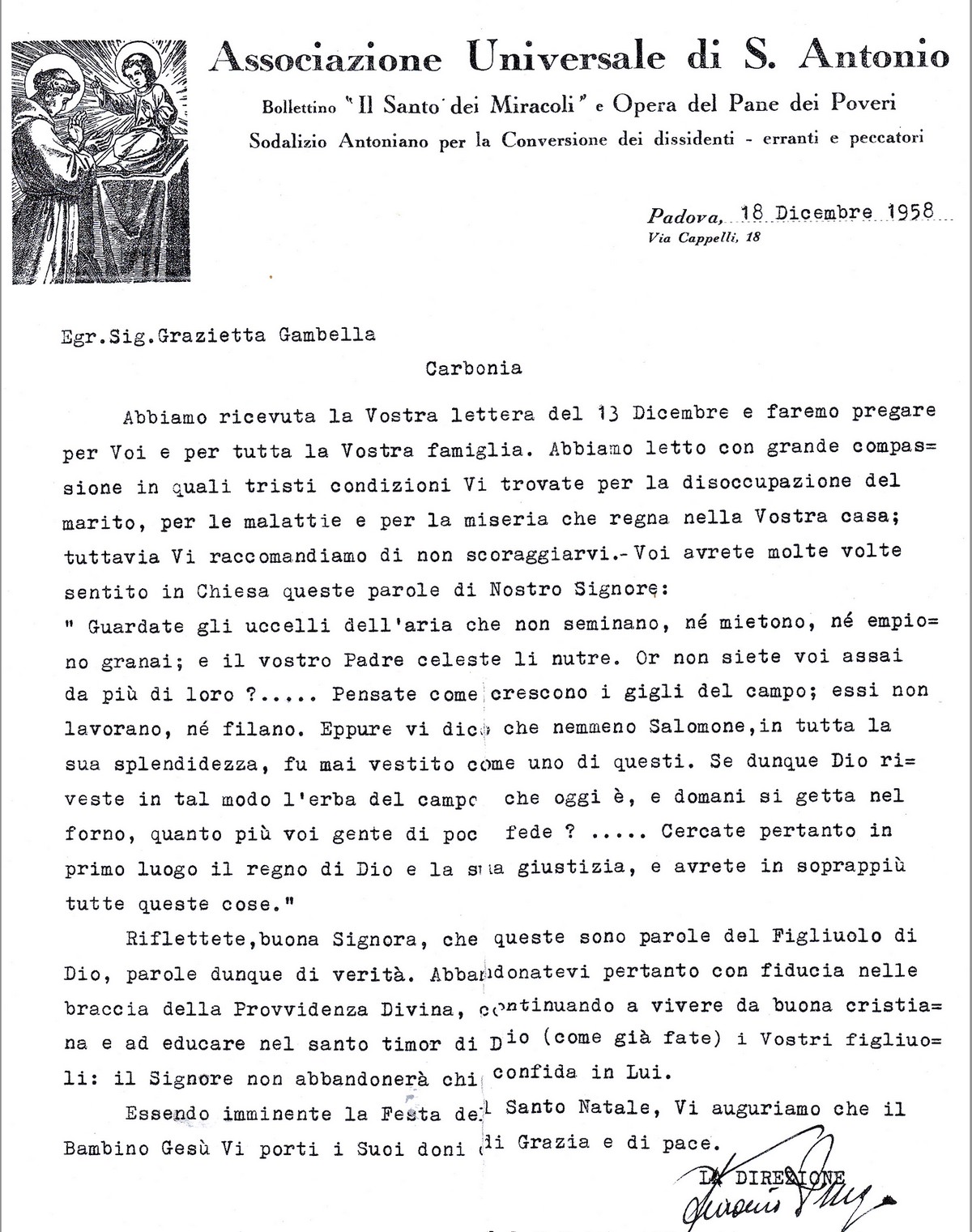 Era il 18 dicembre 1958. In quelle righe, il Direttore dell’Associazione incoraggiava la famiglia – che allora attraversava momenti difficili, segnati dalla mancanza di lavoro e dalle dure condizioni di vita – a non perdere la fiducia nella Provvidenza, certo che il Signore non avrebbe fatto mancare il Suo aiuto.